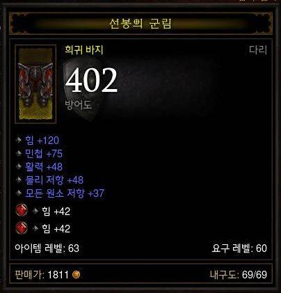 1. 목걸이- 1.극대화 확률, 3.적중 시 생명력, 3.공격속도, 5.힘, 6.모든 저항
