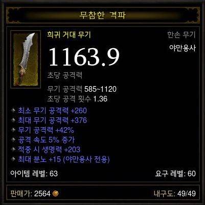 더욱이 힘, 공격속도, 극대화 피해 등의 야만용사에게 매우 유용한 옵션을 가진 거대 무기가 많아 서민 야만용사에게 유용한 무기 아이템이다.