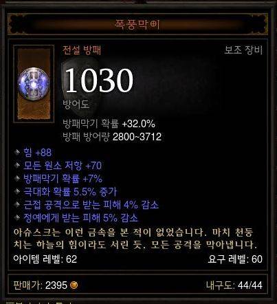 방패는 방어력을 높여주는 것은 물론 힘, 활력, 모든 저항, 극대화 확률 등의 옵션이 추가되어 있어 야만용사에게 생존을 높여주는 아이템이라고 할 수 있다. 방패 아이템을 선택할 때는 우선 1.방패막이 확률, 2. 모든 저항, 3.활력, 4.힘, 5.홈보유 순으로 확인하는 것이 좋다.