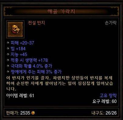 2. 반지- 1.적중 시 생명력 2. 극대화 피해/확률 3.모든 저항 4.공격속도, 6. 힘