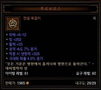 1. 목걸이- 1.극대화 확률, 3.적중 시 생명력, 3.공격속도, 5.힘, 6.모든 저항