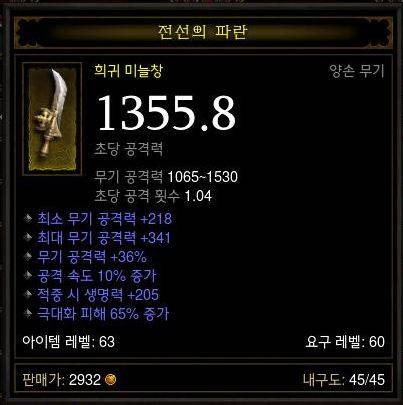 문제는 가격이다. DPS- 1500이 넘는 아이템의 가격은 양손, 한손을 떠나서 적어도 천만 골드이상의 가격을 지불해야 구입할 수 있기 때문에 보통의 게이머들은 다른 손해를 감수 하여 아이템을 구입하여야 한다.