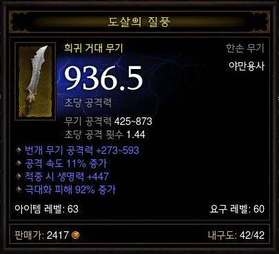 더욱이 힘, 공격속도, 극대화 피해 등의 야만용사에게 매우 유용한 옵션을 가진 거대 무기가 많아 서민 야만용사에게 유용한 무기 아이템이다.