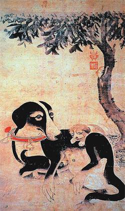 이암(1499∼?)의 '모견도'. 어미 개 검둥이가 새기들에게 젖을 먹이고 있다. 이암은 '모견도' 외에도 강아지를 소재로 한 그림을 즐겨 그렸다. |