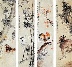 장승업(1843∼1897)의'십곡병풍'에는 다양한 동물이 한데 어우러져 있다. 왼쪽부터 강아지. 두루미, 닭, 사슴이 그려져 있다. |