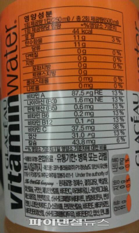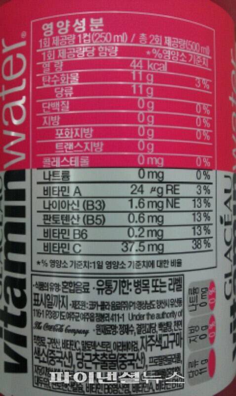 이름부터 비타민 음료인 점을 강조하는 글라소 비타민워터의 경우 250mL당 비타민C의 양은 37.5㎎이다.