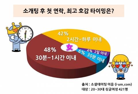 그 결과 "소개팅 후 상대방 남성이 몇 시간 내 첫 연락을 취하는 것이 좋은가?"라는 질문에 싱글여성의 48%(201명)가 '30분~1시간 이내'를 1위로 손꼽았다. 2위는 '2시간~하루 이내(42%, 177명)'였으며 3위는 '30분 이내(6%, 27명)', 4위는 '2일 이내(4%, 16명)'로 나타났다. 2일 이상 지난 경우에 대해서는 단 한 명도 선택하지 않았다.