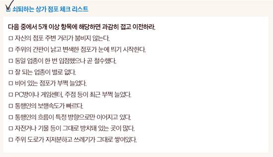 천안의 경우 백화점 2곳과 대형마트 8곳이 자리해 시장은 벌써 레드오션(경쟁이 치열한 시장)으로 변화했다. 대형할인점 경쟁이 심화하면서 자영업자의 설 자리는 더욱 좁아지고 있다. 점포 임대료는 1층 임대료가 가장 높고, 2층과 3층 등 고층으로 올라갈수록 임대료가 낮다. 1층에는 임대료 지불 능력이 큰 약국이나 은행 등이, 고층은 임대료 지불 능력이 상대적으로 작은 학원이나 독서실 등이 자리잡는 것이 일반적이다.