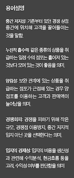 한 지역의 상권에서 사업 성패를 좌우하는 가장 중요한 요소가 바로 입지다. 첫째도 입지, 둘째도 입지, 셋째도 입지라고 할 정도로 입지 여건은 어느 지역을 막론하고 최우선으로 고려해야 할 사안이다.