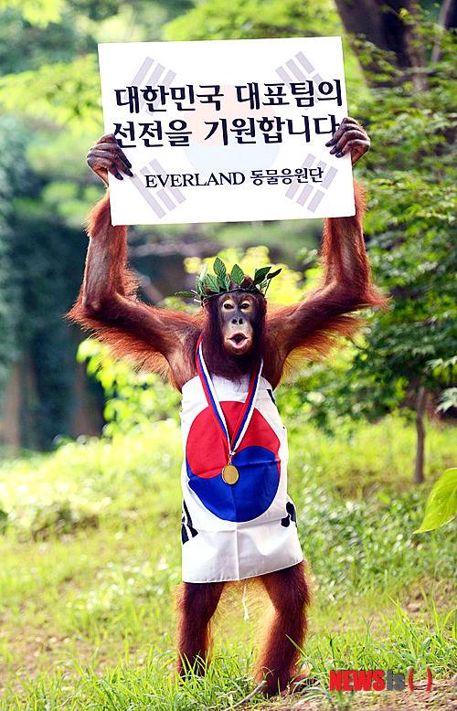 올해로 9살이 된 오랑우탄 '제니'가 대표팀의 선전을 기원하는 문구가 적힌 피켓을 들고 환호하고 있다. 제니가 머리에 쓰고 있는 월계관은 조화 잎 파리를 이용해 제작했다. (사진=에버랜드 제공)