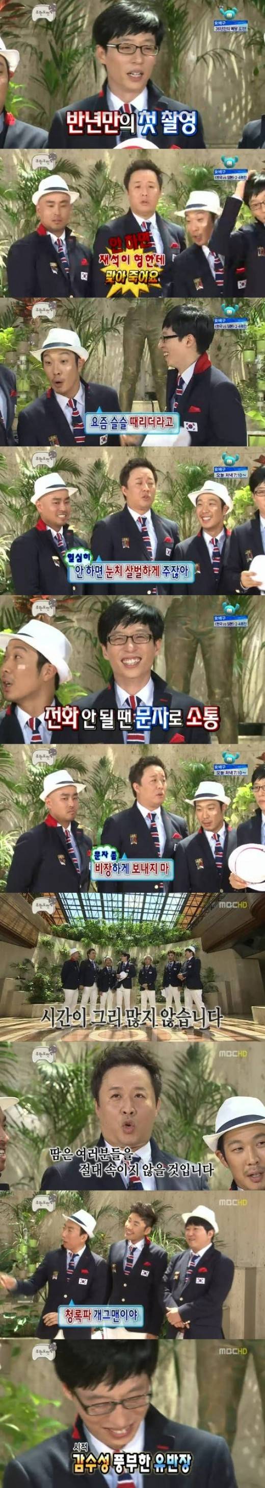 이에 제작진이 "그냥 녹화를 열심히 하면 된다"고 말하자, 하하는 "열심히 안하면 재석이 형한테 맞아 죽는다. 요즘 슬슬 때리더라고"라고 말했다. 이에 유재석이 당황하자, 정준하는 "(열심히) 안 하면 눈치 살벌하게 주잖아"라며 "이젠 안되니까 문자로 보내더라"라고 폭로했다.