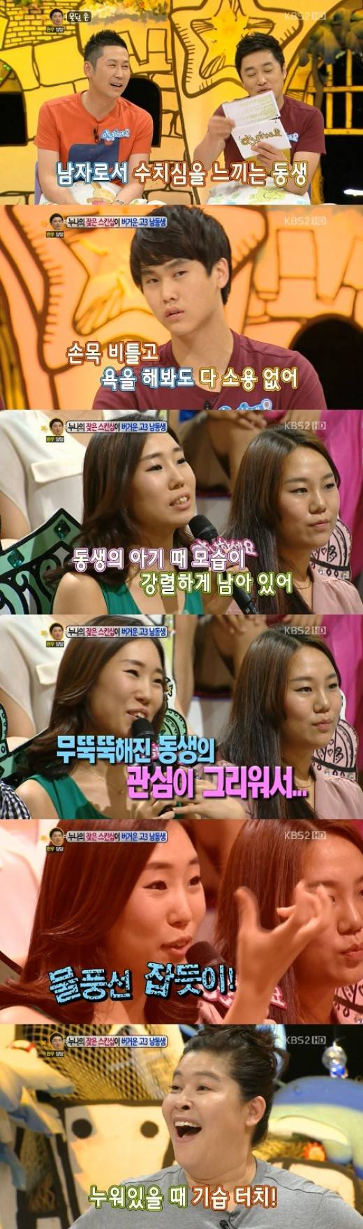 이에 그의 누나는 "어릴 때부터 엄마처럼 동생을 돌봐왔기에 동생의 아기 때 모습이 강하게 남아있다"면서 크면서부터 무뚝뚝해진 동생의 관심을 받고 싶어 일부러 장난스럽게 만지는 것이라고 해명했다. 이어 "(남동생의 주요부위를) 물풍선 잡듯이 잡는 게 아니라 툭 건드리는 정도다. 그러면 반응을 더 세게 보이니까"라고 덧붙였다.