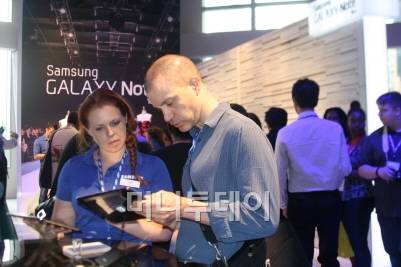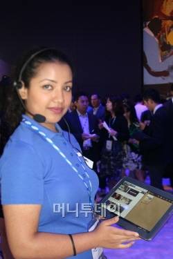 ▲삼성전자 갤럭시 노트 10.1을 보여주는 행사장 안내요원 |
