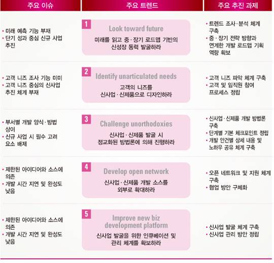 고객의 요구 사항은 갈수록 복잡해지고 빠르게 변화하고 있다. 이를 신제품·신사업 발굴에 적용하는 것이 중요한데 그러기 위해서는 고객과 직접 부딪치며 니즈를 파악하는 체계를 구축하고 고객과 함께 제품 및 사업을 개발할 수 있는 프로세스를 운영하는 혁신이 필요하다.