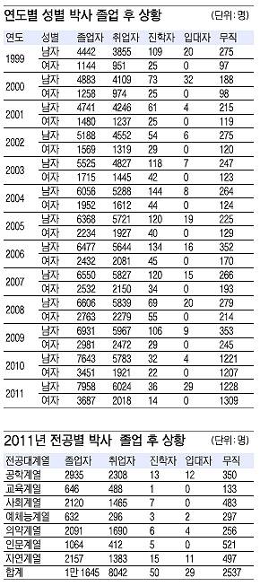 박사 취업난은 이공계보다 인문사회계열이, 남성보다 여성이 더 심각하다. 지난해 공학계열의 박사학위 취득자 2935명 중 2308명(78,6%)이 취업했고, 의약계열은 2091명 중 1690명(80.8%)이 취업에 성공했다. 반면 인문계열은 1064명 중 412명(38.7%)만 취업하는 데 그쳤다. 특히 국문학 박사는 221명 중 64명, 중문학 박사는 44명 중에 14명, 영문학 박사는 96명 중에 25명만 취업하는 등 어문계열의 취업난이 두드러졌다. 사회계열은 2120명 중 1465명(69.1%)으로 비교적 높았지만, 상경이나 법학 등 계열 특성상 졸업생 중 직장을 다니는 사회인이 많아 실제 취업률은 이보다 낮을 것으로 보인다. 예체능 계열의 경우 632명 중 296명만이 취업했지만, 전공 특성상 프리랜서가 많아 뚜렷한 의미가 없다는 것이 KEDI의 분석이다. 한국연구재단 관계자는 "이공계 졸업생이 대학과 연구소, 기업 등 순차적으로 눈높이를 낮출 수 있는 선택의 폭이 있는 데 비해 인문계열은 교수 아니면 회사원뿐"이라면서 "인문계는 해외 진출도 힘들다."고 밝혔다.