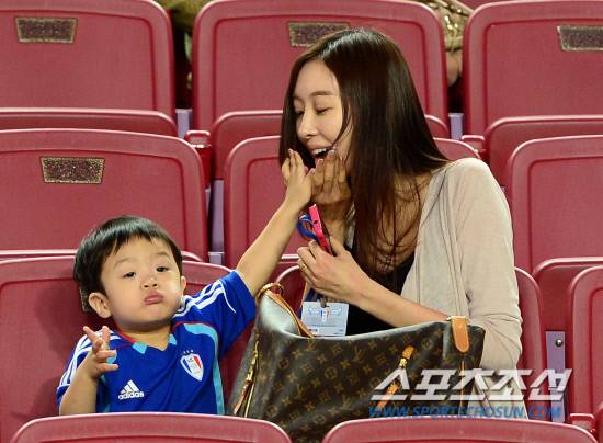 23일 오후 수원월드컵경기장에서 현대오일뱅크 K리그 2012 수원삼성과 대전시티즌의 경기가 열렸다. 수원 정성룡 골키퍼의 미모의 부인 임미정씨가 아들과 함께 경기장을 찾아 경기를 관전했다. 수원=송정헌 기자 songs@sportschosun.com/2012.8.23
