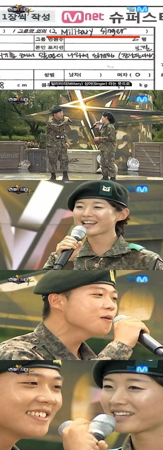 한편 강수연 김규열은 로맨틱한 듀엣곡을 열창해 심사위원들의 눈길을 끌었다. 그러나 안타깝게도 미모와 실력의 조화로 하사 강수연만 합격했다. 김규열은 "우리 어울린다고 해놓고 강수연 하사만 합격 시켰다"고 볼멘소리를 해 웃음을 자아냈다. (사진=Mnet '슈퍼스타K4' 캡처)