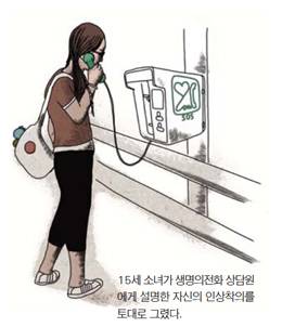 하지만 엉엉, 흑흑, 으으, 어어엉 쉴새 없이 흐르는 그녀의 흐느낌을 글에는 오롯이 입힐 수가 없다. 가냘픈 새소리를 닮은 그녀의 목소리도. 기자의 덩둘함을 탓하며 날것 그대로의 통화내용을 에누리없이 편지로 다시 엮는다. 어쩌면 소녀는 상담원이 아니라 무관심한 우리 모두에게 말을 건네고 있는지 모른다. 중간중간 숫자는 상담원 음성 부분이다. 당신이라면 어떤 말을 소녀에게 했을까, 답은 말미에 있다.