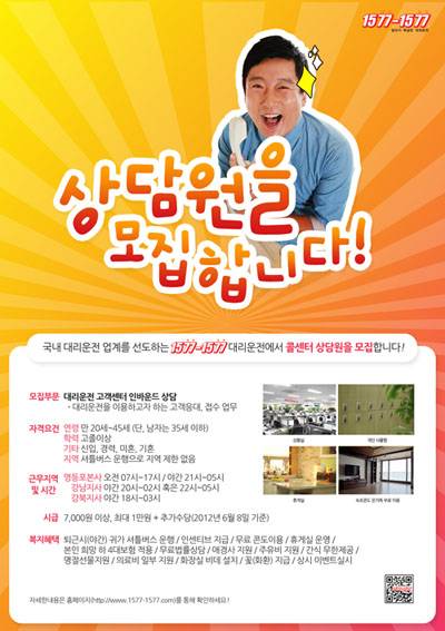 [라이프팀]코리아드라이브(대표 김동근)가 1577-1577 대리운전 콜센터 상담원을 채용한다고 밝혔다.