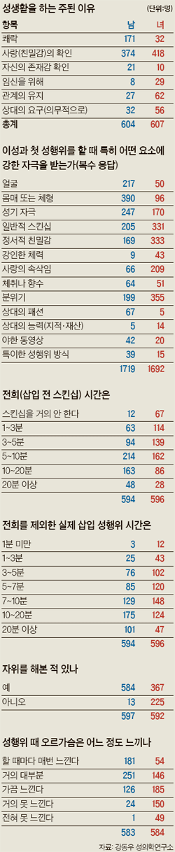 올해 5월 강동우 성의학연구소가 대한민국 성인 남녀 1246명을 대상으로 '한국인의 성생활 및 성의식 조사'를 실시한 결과 응답자의 88.8%가 '성생활이 인간 관계에 중요하다'고 답한 것으로 나타났다. 남성 628명 중 580명이, 여성 618명 중 526명이 이같이 응답했다. 통계 수치만 놓고 보면 성생활의 중요성을 모르는 사람은 거의 없어 보인다.