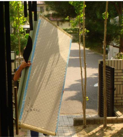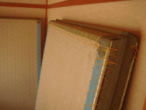 | ▲ 다다미 뒷면입니다. 스티로폼을 골풀로 짠 돗자리로 싸고 실로 엮어서 묻어두었습니다. |