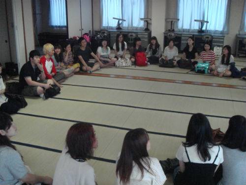| ▲ 일본사람들은 단체로 합숙을 하는 경우 남녀 따로따로 큰 다다미방에서 나누어서 자거나 일을 합니다. 다다미 50 장에서 100 장이 넘는 큰 방도 있습니다. 학생들이 다다미방에 앉아서 이야기를 나누고 있습니다. |