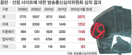 17일 방송통신심의위원회 등에 따르면 해외에 서버를 두고 당국의 추적을 피해 운영 중인 음란·선정 사이트는 수천개에 달하는 것으로 추정되고 있다. 위원회에서 '해외 서버 음란·선정 사이트'를 차단한 건수도 2009년 1475건에서 지난해 3998건으로 배 가까이 뛰었다. 올해는 지난 상반기까지 1494건을 기록했다.