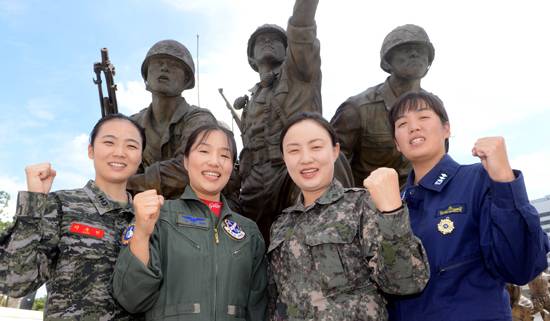 지난 11일 오후 서울 용산 전쟁기념관에 육ㆍ해ㆍ공군과 해병대 등 각군의 장교 4명이 광주 경기 전남 등지에서 모였다. 육군 김성현(35ㆍ여군 46기), 공군 박지연(34ㆍ공사 49기) 소령과 해병대 이숙연(32ㆍ해사 57기), 해군 김귀미(29ㆍ해사 60기) 대위가 그 주인공이다. '여군 전성시대'가 열린 듯 여성의 군 진출이 활발해지고 있는 요즘 대한민국에서 직업 여군으로 살아간다는 게 어떤 것인지 들어보기 위해 한국일보가 마련한 자리였다. 모두 여성의 군 참여가 본격 늘기 시작한 2000년대 초ㆍ중반 임관한 여성 장교들로, 박 소령과 김 대위는 각각 여성 최초의 전투기 편대장과 함대 소속 고속정장이라는 타이틀도 갖고 있다. 이들을 군으로 이끈 것은 거창한 꿈이 아니라 사관학교에 대한 환상이었지만 "군 생활을 그만두고 싶었던 때가 없었다"고 했다.