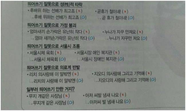 △'엄마새끼 손가락은 유난히 작다'=낱말과 낱말 사이의 띄어쓰기를 왜 잘 해야 하는지를 보여주는 단적인 예다. 올바른 쓰기는 '엄마 새끼손가락은 유난히 작다'다.△'누나가 자꾸 만져요'=정말 큰 일 날 말이다. '누나가 자꾸만 져요'로 올바르게 사용해야 할 말이다.