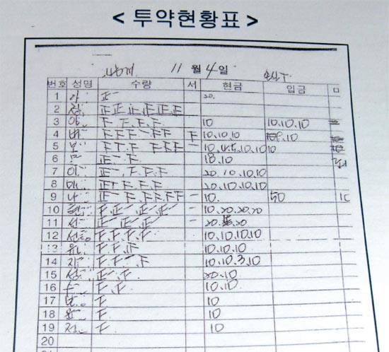인천 남동경찰서가 2010년 구월동의 한 의원에서 확보한 프로포폴 투약 현황표. 바를 정(正)자 한 획이 프로포폴 약 10mL 들어간 한 앰풀을 뜻한다. 하루 동안 이 병원에서 환자 19명에게 프로포폴 앰풀 246개가 투여돼 매출이 643만원으로 기록됐다. [김민상 기자] 사정이 이렇다 보니 중독자들은 갈수록 늘고 있다. 유흥업소에서 일했던 A씨(30·여)는 인천의 한 성형외과에서 지방분해 주사를 맞으면서 프로포폴에 중독됐다. 한때 병원 문이 닫힐 때까지 하루 18시간 30여 병을 맞은 적도 있었다. 먹는 것도 잊어버려 뼈만 앙상하게 남았다고 한다. A씨는 "잠을 못 자고 신경이 날카로울 때면 지금도 생각난다"고 말했다. 또 다른 유흥업소 종업원 출신 B씨(32·여)는 프로포폴을 맞는 데 6억원을 넘게 썼다고 한다. 그는 "수십 개의 주사 바늘로 멍이 든 손목을 보고도 병원에서 프로포폴을 투약해줬다"고 말했다.