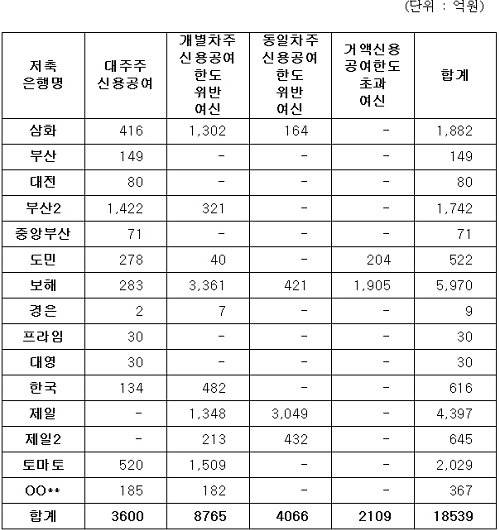 또, 불법·부실대출을 유형별로 살펴보면 대주주 신용공여 위반 3600억원, 개별차주 신용공여 한도위반 8765억원, 동일차주 신용공여 한도위반 4066억원, 거액신용 공여한도 초과 2109억원으로 나타났다.