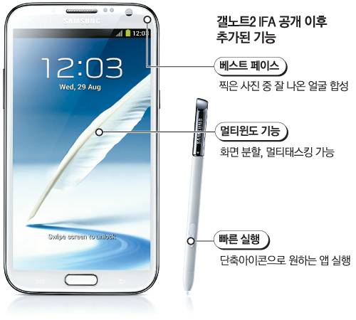 삼성전자는 26일 서울 서초사옥에서 5.5인치 대화면과 필기 기능을 강화한 갤럭시노트2를 발표하고 이날부터 판매를 시작했다.