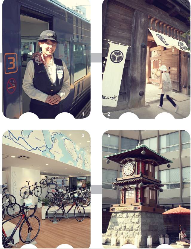 1 이시즈치 열차 앞 기차 안내원 2 현재 일본에 12개밖에 현존하지 않는 에도시대 이전에 건축된 천수의 마쓰야마 성 3 이마바리역 내에 위치한 자이언트 스토어 4 에히메현의 도고온천역 앞에 있는 봇짱 가라쿠리 시계. 매 정시마다 시계탑이 열리고 < 봇짱 > 의 등장인물들이 나온다