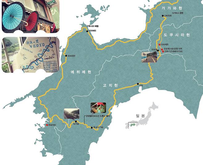 * 시코쿠 가는 방법 아시아나항공이 인천에서 다카마쓰(가가와현)와 마쓰야마(에히메현)로 가는 직항편을 일주일에 3회 운영하고 있다. 마쓰야마로 가는 항공편은 화·금·일요일, 다카마쓰로는 화·목·일요일에 출발한다. 다카마쓰로 입국하고 마쓰야마에서 출국하는 일정(그 반대)도 가능하다. 인천에서 소요시간은 각각 1시간 30분여 정도다.