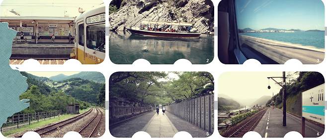 1 고토히라에서 고토덴 열차를 타고 리츠린 공원에 도착하는 중 2 오보케협곡을 따라 30여 분간 뱃놀이를 즐길 수 있다 3 세토내해의 드넓은 바다 풍경을 감상할 수 있었던 이시즈치 특급열차 4 작은 간이역들과 깊은 산속 길을 달려 도착한 오보케역의 풍경 5 고토히라구 신사로 올라가는 길에 보이는 비석들. 신사에 헌금을 기부한 사람들의 이름을 새겨놓은 비석들이다 6 도롯코 열차로 갈아타기 위해 기다리던 도카와역