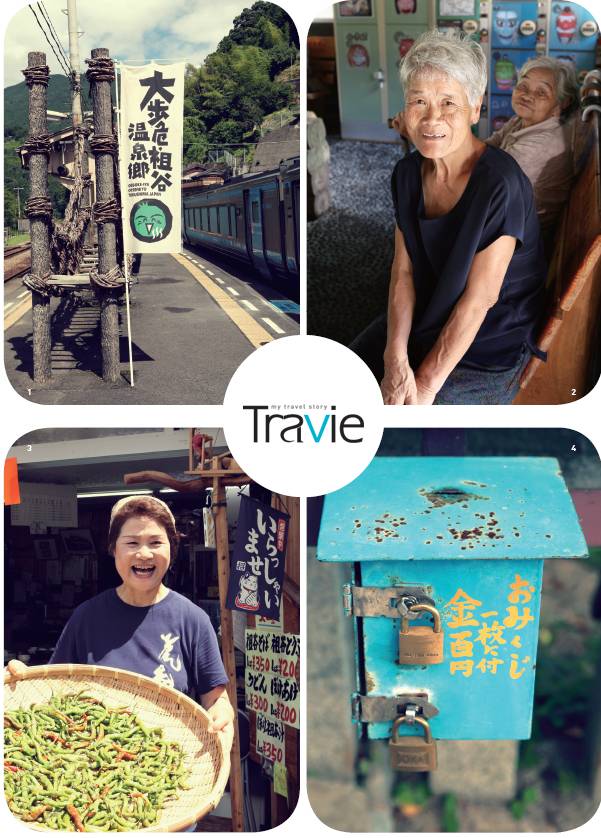 1 이야 계곡 주변에는 카케나가시 원천의 노천탕을 갖춘 온천도 여러 곳 있다 2 100여 명이 채 안 되는 사람들이 살고 있는 이야마을의 오보케역에 놀러나오신 동네 할머니 3 이야마을로 시집 와 51년째 살고 있는 보께마트의 유키코 아주머니. 마을에서 직접 딴 고추 바구니를 들고 포즈를 취하고 있다 4 고토히라 신사에서 내려오는 길에 본 길거리의 작은 사물함