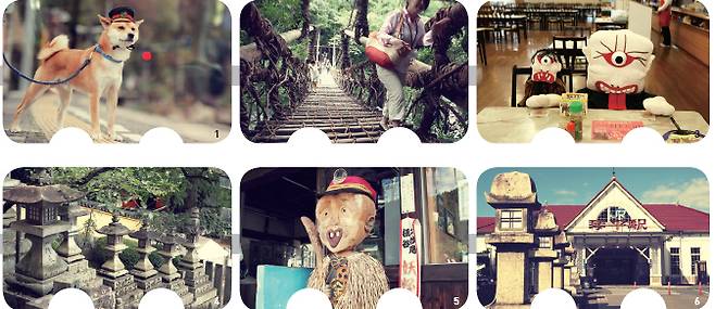 1 무인역인 오보케역에서 고나키 역장을 도와 일요일마다 역으로 출근을 하는 고오타로 강아지 2 덩굴나무만을 엮어 만든 카즈라바시 다리 3 오보케 협곡 유람선 표를 파는 지역 휴게소 내의 음식점 한켠에는 고치현에 사는 요괴 인형이 놓여 있다 4 고토히라구의 고혼구 부근에 세워져 있는 석등 5 오보케역에서 승객들을 맞이하고 있는, 개암나무로 만든 고나키 역장 6 고토히라역에서 내리면 유난히 낡은 상점과 집들이 과거로 돌아간 듯한 운치를 한껏 느끼게 해준다