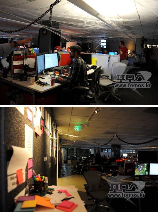 뭔가 으스스한 분위기가 감도는 여기는 개발팀 오피스랍니다. 본사 투어를 안내해주신 직원분이 할로윈이 얼마 남지 않아서 거미와 거미줄 장식으로 사무실을 꾸몄다고 설명해주셨어요. 한쪽 벽면에는 일정과 중요 내용을 적은 포스트잇이 빼곡합니다. 내용은 절대 기밀!