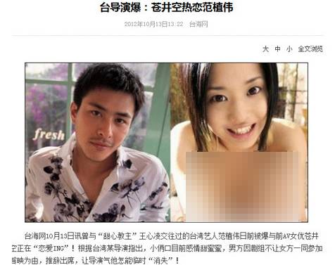최근 대만 현지 매체들은 유명 연출가의 말을 인용해 아오이 소라와 판즈웨이가 뜨겁게 열애중이라고 보도했다.