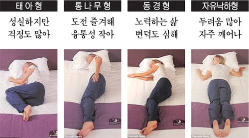 '태아형'은 옆으로 누워 웅크리고 자는 자세로 가장 흔하다. 스트레스에 시달린 날 편안함을 찾기 위해 이 같은 자세를 취한다. 이런 사람은 성실하고 정리를 잘하지만 쓸데없는 걱정이 많다. 옆으로 누워 몸과 팔다리를 똑바로 펴는 '통나무형'으로 자는 사람은 융통성이 작고 고지식하며 그룹에서 우두머리 행세를 하려 한다. 장점은 새로운 도전을 받아들이고 즐긴다.