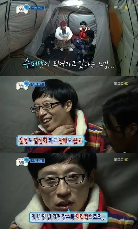 하하는 "재석이 형을 보면 슈퍼맨같다. 운동도 열심히 하고 담배도 끊었다"고 말했다. 이에 유재석은 "내가 좋아하는 무언가를 포기하지 않으면 두개를 가질 수 없다. 일년일년 가면 갈수록 체력적으로도 힘들다. 대비하지 않고 준비하지 않으면 안된다"고 말했다.