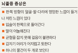 뇌졸중은 크게 두 가지다. 뇌혈관이 터지는 '뇌출혈'과 서서히 좁아지거나 피떡(혈전)으로 막히는 '뇌경색'이다. 최근엔 뇌경색이 전체의 70~80%를 웃돌 만큼 많아졌다. 서구화된 식생활과 운동 부족·스트레스·비만 탓이다. 불행하게도 뇌졸중 발병 연령대가 30~40대까지 내려왔다.