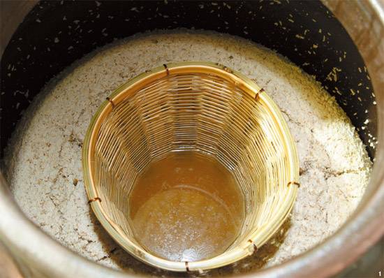 1 용수가 박혀있는 술덧. 용수 안으로 맑은 술이 괸다.
