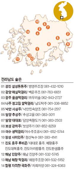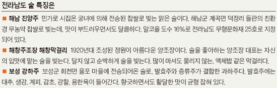 전통적으로 남쪽 지방에서는 소주보다는 탁주를 많이 소비했고, 술이 상하기 쉬운 여름에만 소주를 내려 마셨다. 하지만 전남을 대표하는 술은 뭐니뭐니해도 진도 홍주다. 진도 사람이면 죄다 홍주를 내릴 줄 안다고 말할 정도다. 진도 홍주는 계절적 특성보다 섬의 특성이 더 반영돼 있다. 유배 온 선비는 홍주로 위안을 받았고, 바닷가 사람들은 홍주로 억센 노동을 위로받았다.