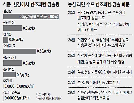 전문가들은 벤조피렌이 세계보건기구(WHO)가 '1급 발암물질'로 규정한 물질이긴 하지만, 일상생활에서 흔히 접할 수 있는 것이라고 말한다. 따라서 기준치 이하일 경우 우려할 필요가 없다는 것이다. 예를 들어 이번에 농심 라면 수프 1개에서 0.000005㎍의 벤조피렌이 나왔지만, 우리 국민들이 삼겹살을 구워먹을 때 하루 평균 그 1만6000배인 0.08㎍을 섭취하고 있다. 또 생선구이에도 0.1~0.3㎍, 참기름 등에도 0.08㎍ 들어 있고, 담배 연기, 자동차 배기가스 등에도 있다. 고려대 이광원 교수(식품공학부)는 "벤조피렌은 굽고 튀기는 과정에서 자연적으로 생겨 일상생활에서 접할 수밖에 없다"며 "60kg 성인 기준으로, 하루에 0.24~0.78㎍ 정도를 섭취할 것"이라고 말했다.