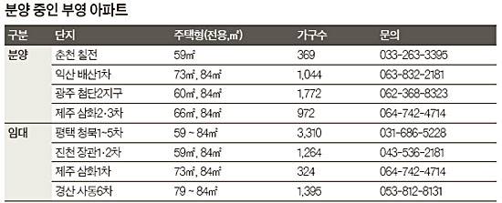 부영주택은 경기도 평택, 경북 경산, 강원도 춘천, 충북 진천, 광주광역시, 전북 익산, 제주 등 7개 지역에서 사랑으로 부영 임대 및 분양아파트 1만여가구를 잇따라 분양한다. 평택 청북 사랑으로 부영 1~5차는 총 3310가구의 대규모 단지다. 지하 1층, 지상 13~20층 49개동 전용면적 59~84㎡형 중소형으로만 구성된 것이 특징이다. 분양가는 3.3㎡당 평균 580만~650만원 선이다.