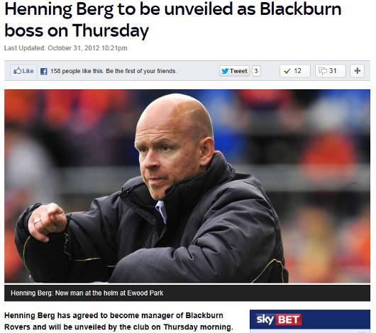 영국의 스포츠 전문 매체 < 스카이 스포츠 > 는 1일(한국 시각)"블랙번이 전 블랙번 소속의 수비수이자 전 맨체스터 Utd.의 스타 헤닝 베르그를 새 감독으로 선임했다"라고 보도했다.