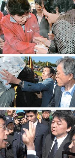한 지지자가 오른손을 세게 잡자 아픈 표정을 짓는 박근혜 후보(사진 위). 문재인 후보에게 공격적으로 달려드는 군중을 경호원이 제지하는 모습(가운데). 갑자기 등장해 거친 말을 퍼붓는 사람 앞에서 난감한 표정을 짓는 안철수 후보(아래). [중앙포토] 제18대 대통령 선거가 32일 앞으로 다가오면서 후보자들의 안전을 담당하는 경호원들의 긴장감도 높아지고 있다. 이 같은 경찰 경호에 대한 후보들의 성향은 크게 세 종류로 나뉜다.