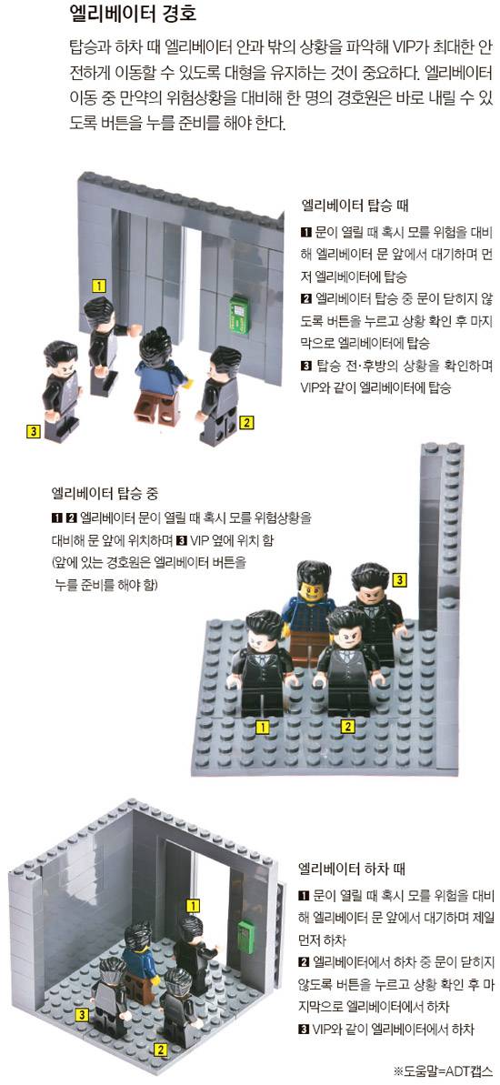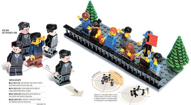 경호원들에겐 현장에서 반드시 지켜야 하는 4대 원칙이 있다. 첫째는 '3선 경호의 원칙'이다. 경호 대상자와 가장 가까운 거리는 물론 중간지대와 외곽의 3선까지 임무를 수행하는 것이다. 언제 어디서 위험요소가 나타날지 모르기 때문에 최대한 넓은 범위에서 안전을 확인하려는 목적이다. 둘째는 '두뇌 경호의 원칙'이다. 단순히 현장에서 몸으로 때우는 식으로는 경호 임무를 제대로 수행할 수 없다. 따라서 사전에 치밀한 준비와 계획을 세워 위험요소를 미연에 방지하는 데 중점을 둔다.