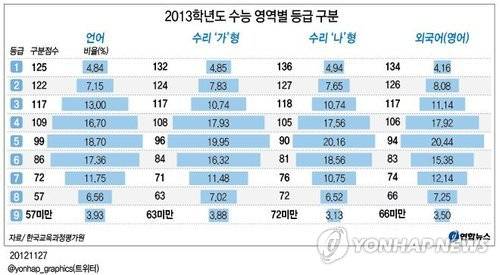(서울=연합뉴스) 김태균 기자 = 수험생들이 28일 받는 2013학년도 대학수학능력시험 성적표에는 영역ㆍ과목별로 표준점수와 백분위, 등급이 기재된다.
